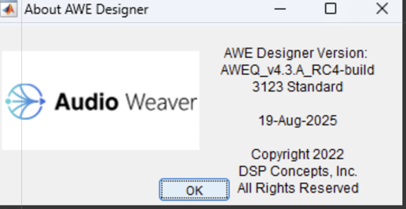 AWE-Q or QAR SDK version: <e.g. AWE-Q v4.2.A or QAR SDK v4.7.C.0>AWE Designer build: <from Help->About AWE Designer, screenshot is OK>HW Target: <e.g. ADP Air v3 8255>Qualcomm Software Product Baseline: <e.g. SnapdragonAuto.HQX.5.7.7.0 r00001.3[ES0]>AWECore Build numbers (shown in AWE Server).Thanks,