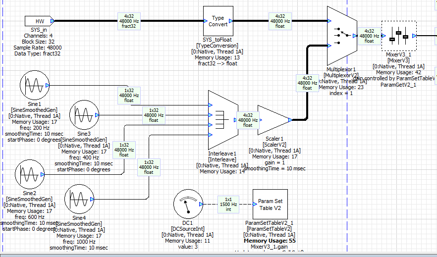I have 4 sine waves at easily distinguishable frequencies being interleaved onto a single wire and then feeding into the mixer when the Multiplexor index = 1 (checkbox selected).