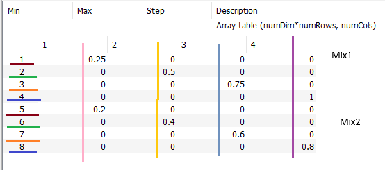 Each set of gain values is one of the columns. The upper half of the column affects Mix1 and the lower half affects Mix2.