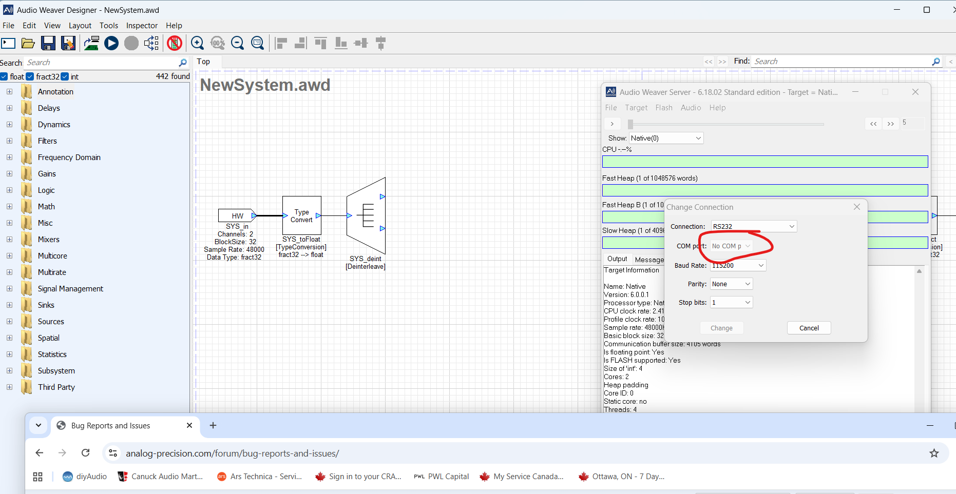 I cannot change connection to the needed RS232 (over USB). I get "No com port" in a greyed out box even though the ini file for AWE server seems to become enumerated with the correct com port number. Are there any advanced settings that need to be tweaked?
