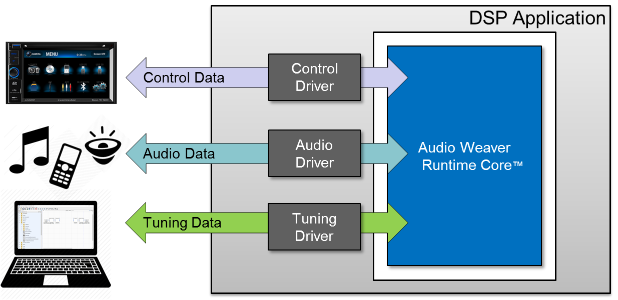In a typical "embedded" audio system, there's some custom firmware (mostly C-code) that sets up the IC's peripherals, the initializes the converters, configures the DMAs, etc; once this is debugged, you can do a very simple, raw audio pass-thru/loopback from RX to TX (i.e. the equivalent of 'hello world' in the embedded-audio world.) Into this 'pass-through' system, you plug-in the AWE Core, feeding RX audio in, and pulling freshly processed audio out and copying it to the TX buffers. (You also add a little 'plumbing' code to get the tuning commands, and control-knob data over into the AWE Core.)